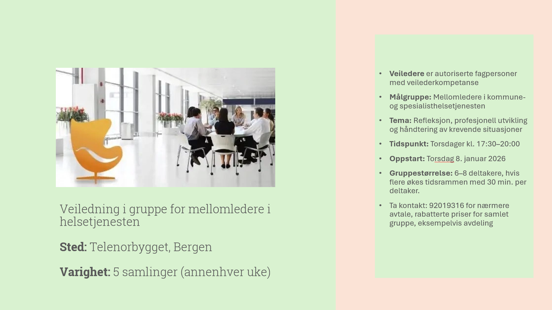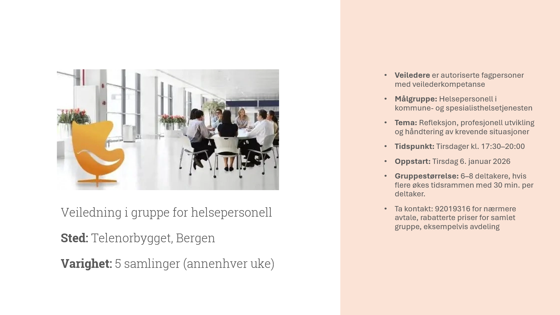 Ta kontakt for mer informasjon eller avtale om gruppeveiledning for teamet ditt. Telefon: 92019316
